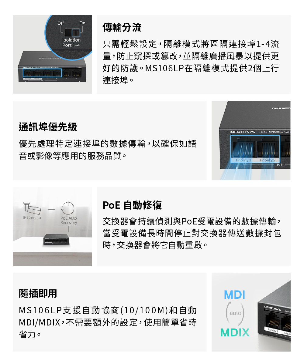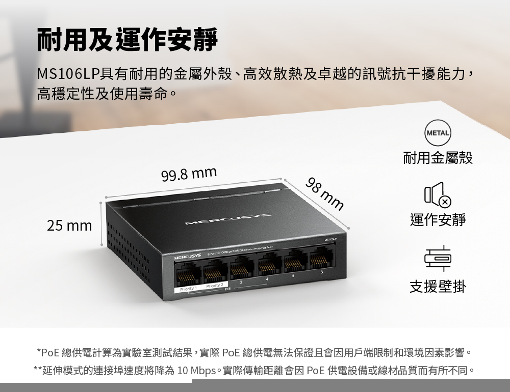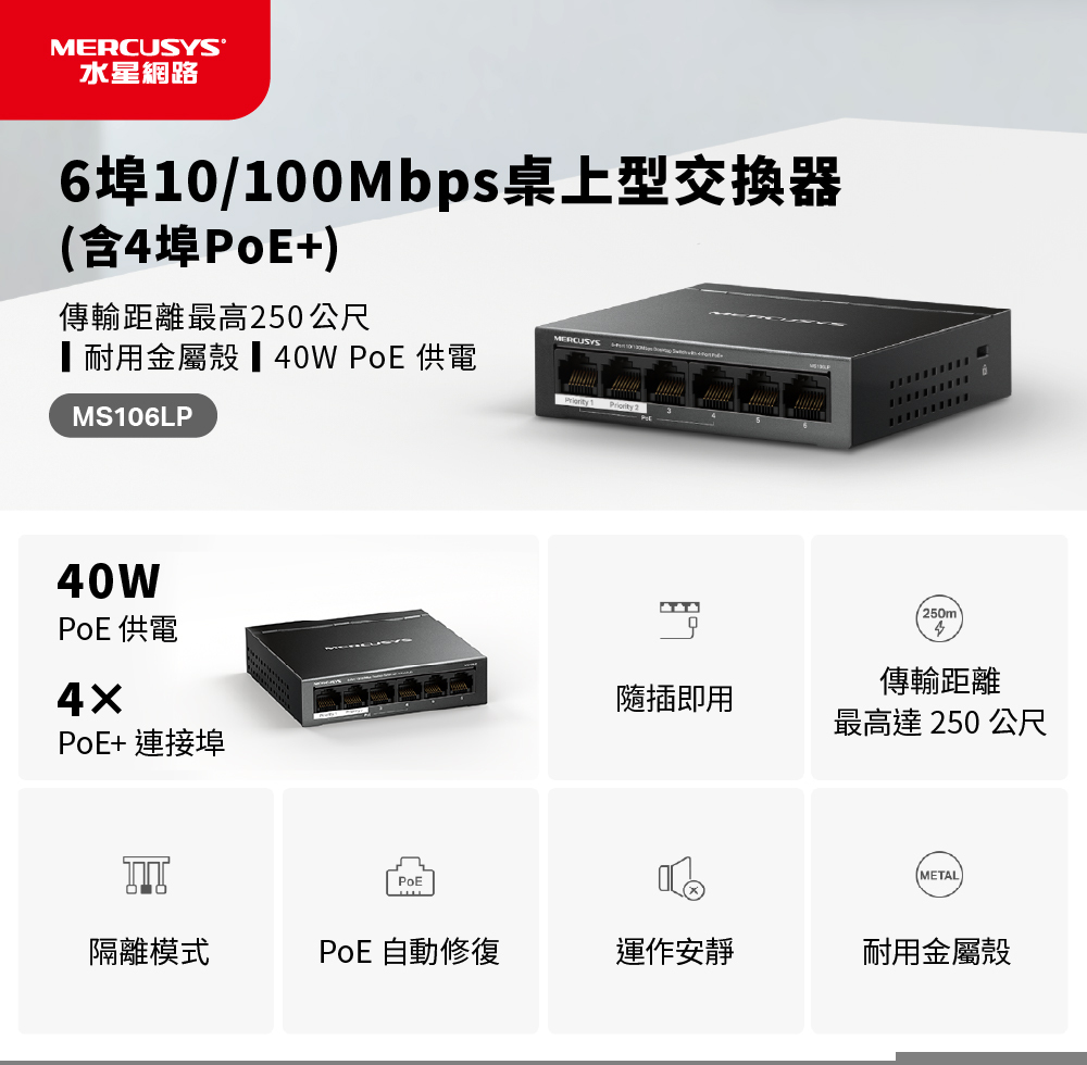 MERCUSYS 水星 MS106LP 6 埠 10/100Mbps 桌上型交換器 (含 4 埠 PoE+)