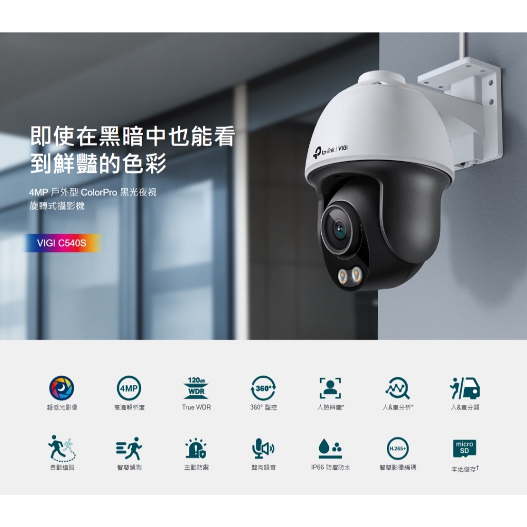 TP-LINK VIGI 4MP 戶外型 ColorPro 黑光夜視旋轉式監視器 VIGI C540S-4